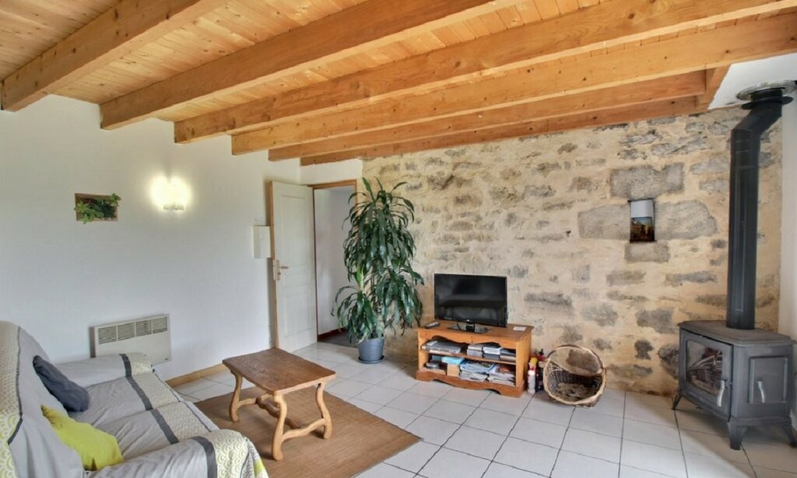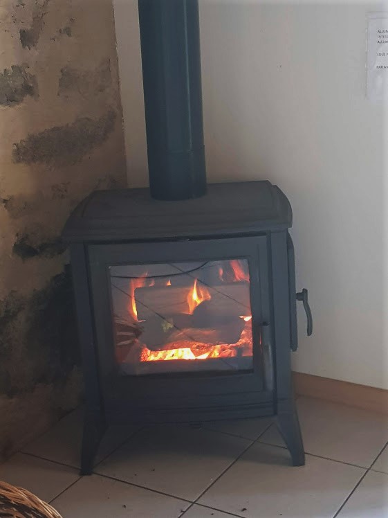 - Un espace salon pour passer d’agréables soirées en en amoureux, avec canapé et table basse au coin du poêle à bois