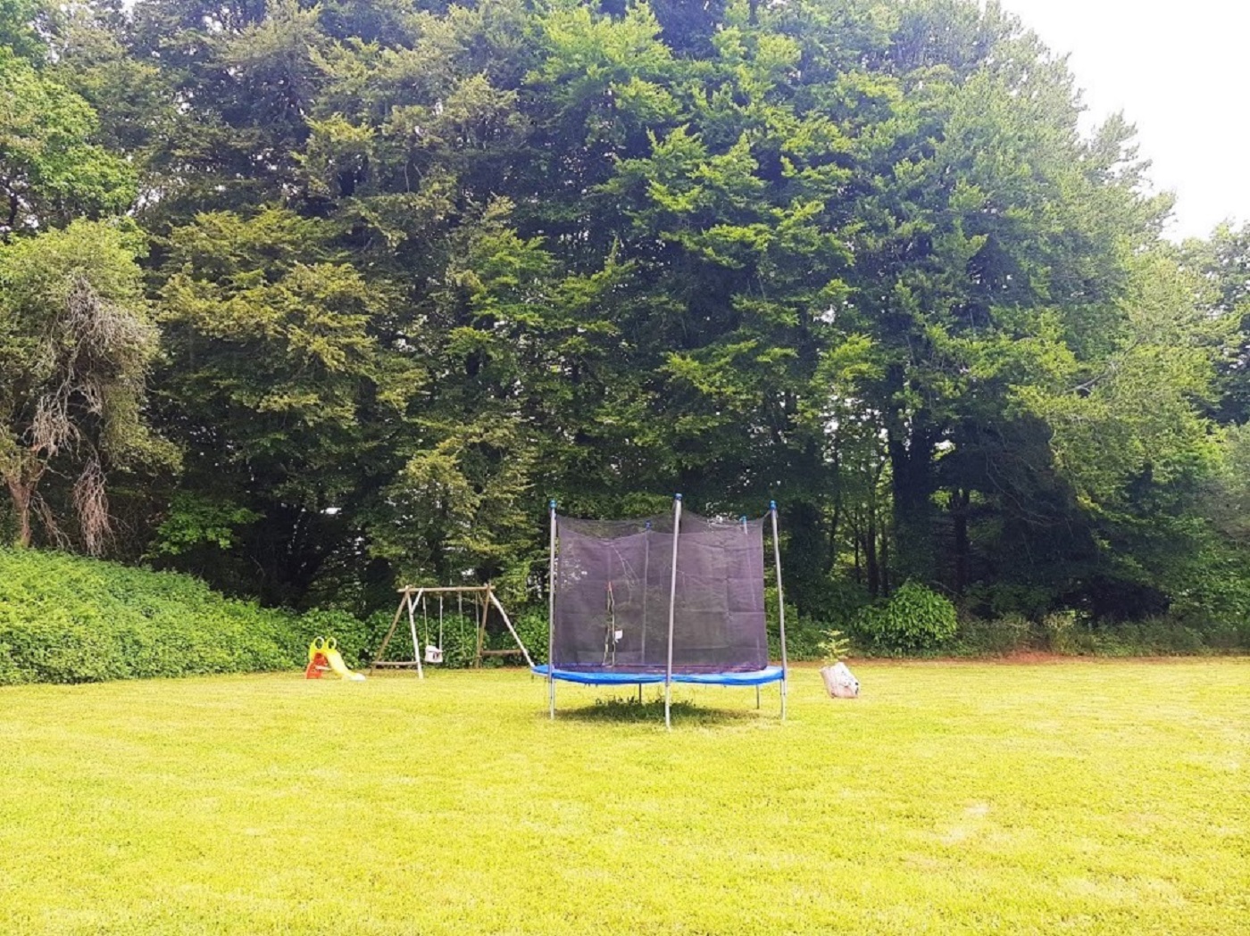 Jardin avec aire de jeux commun aux trois gîtes : balançoire, toboggan, trampoline.